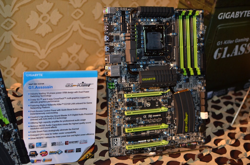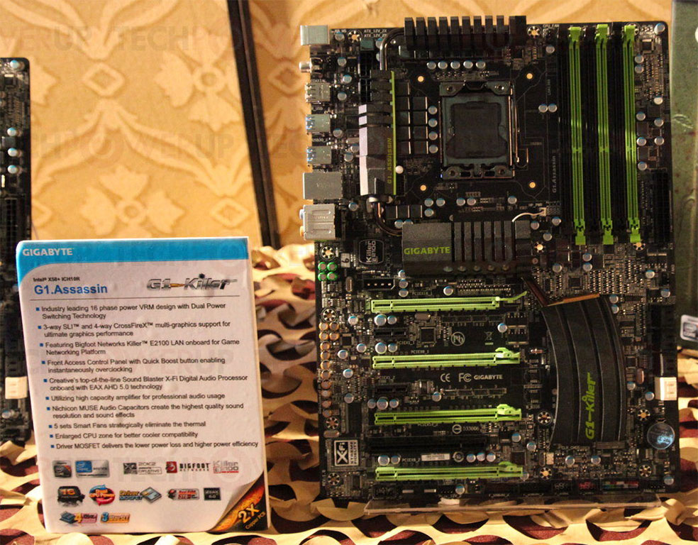Gigabyte G1.Assasisin: Esta placa a diferença da anterior (G1.Guerrilha) vem em formato XL-ATX e vai mais enfocada aos overclockers porquanto incorpora uma fase de alimentação mais poderosa, além de um arsenal de características enfocadas no overclock. Suporta até 4 cartões de video em 4-way SLI/CrossFireX, incorpora uma fase de alimentação de 16 etapas, 4 portos PCIe x16, 1 porto PCIe x1 e 1 PCI. A placa também conta com conectores USB 3.0 e SATA 6.0Gbps e tal como o modelo G1.Guerrilha incorpora um NPU (Network Processing Unit) Bigfoot Killer 2100 hardware NIC com 1GB de cor DDR2 dedicada, quanto a áudio a placa incorpora um processador CA20K2 que incorpora 64MB de cor dedicada.