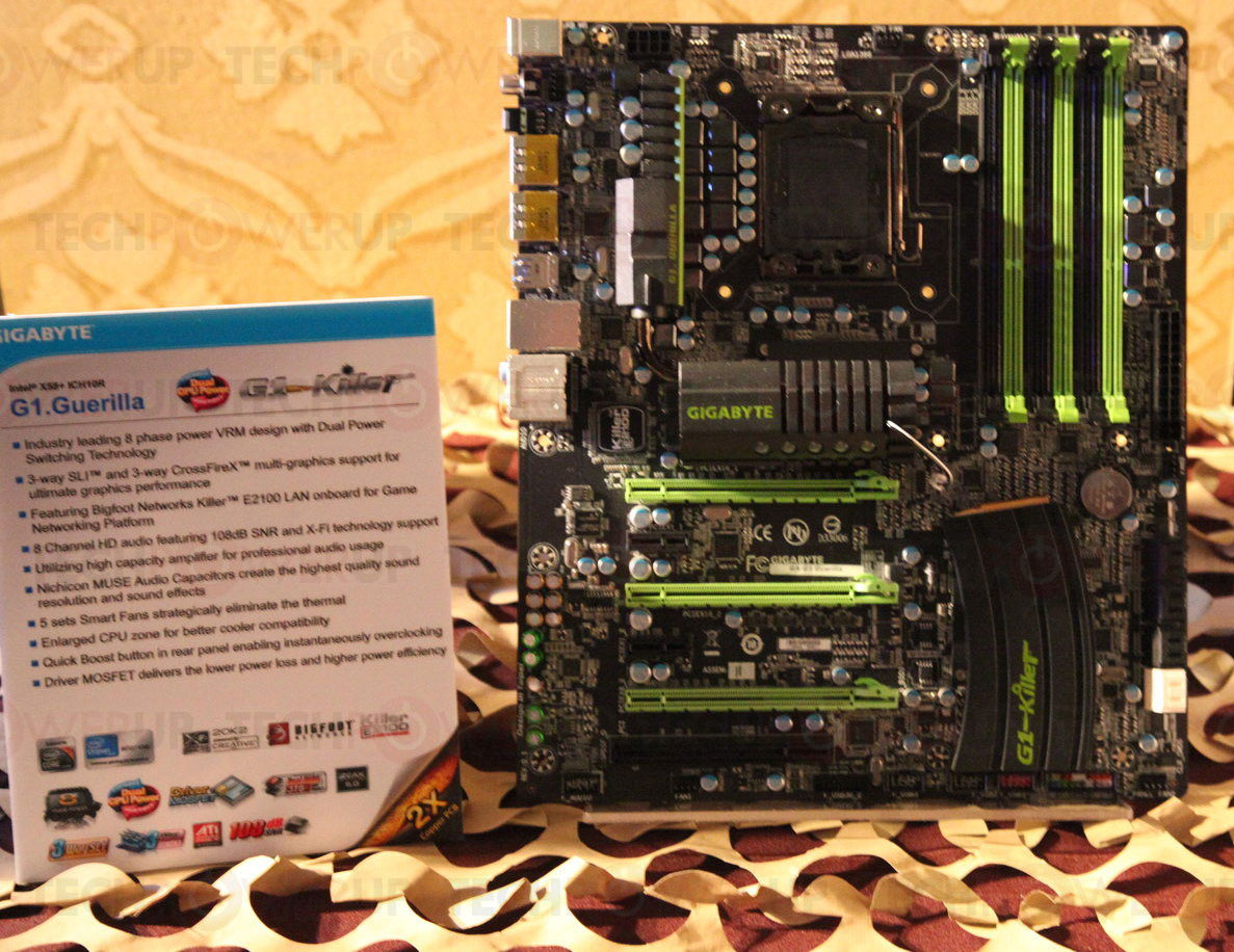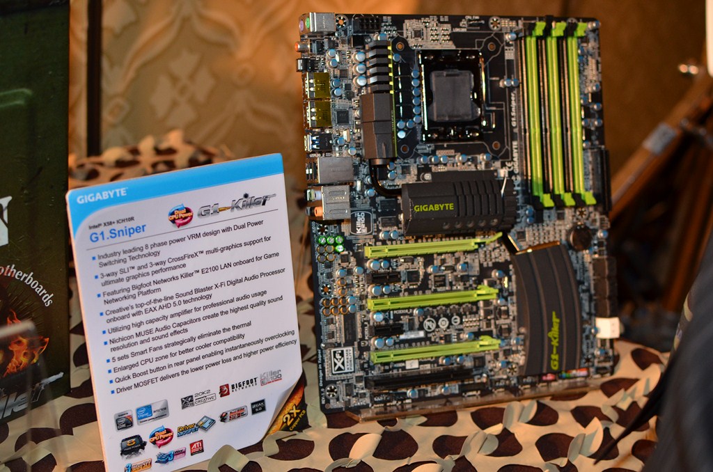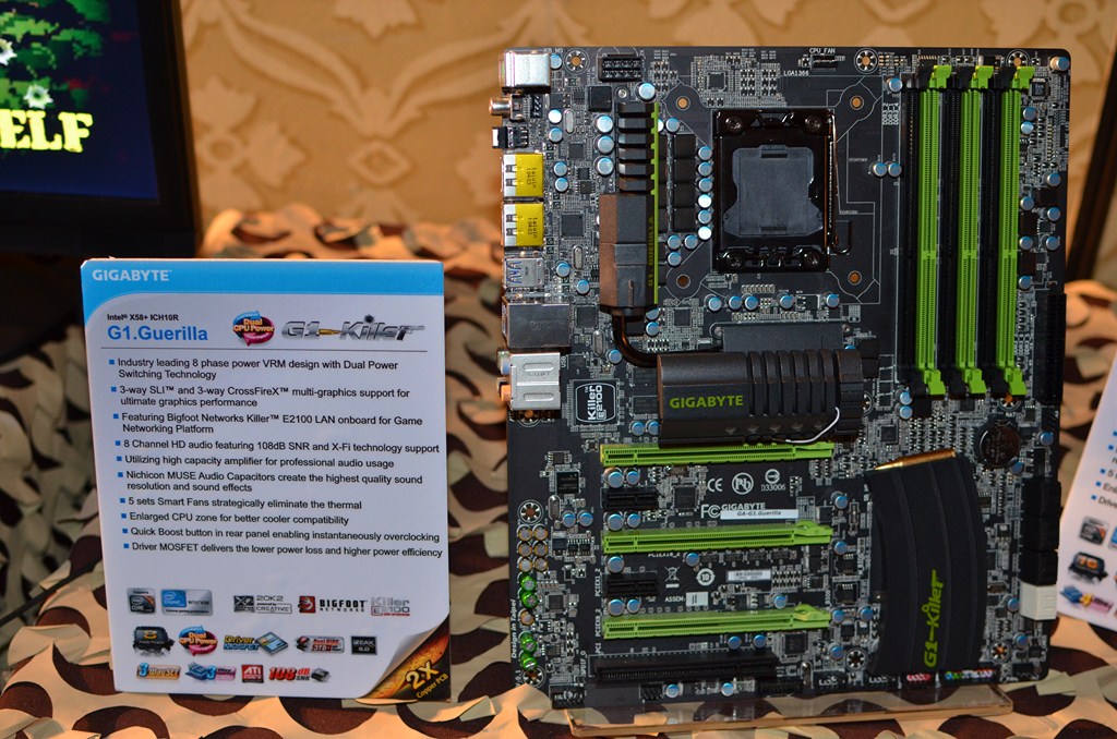 Gigabyte G1.Gerrilla: Esta placa em formato ATX possui uma fase de alimentação 8+2 VRM, 6 slot DIMM DDR3 para triplo-channel, 3 portos PCI Express 2.0 x16, com suporte para 3-Way SLI e CrossFireX, 2 portos SATA 6.0Gbps, 2 portos USB 3.0, mais características enfocadas netamente aos jogadores como um NPU (Network Processing Unit) Bigfoot Killer 2100, Áudio HD com tecnologia X-FI, entre outras características que podem ver na imagem respectiva.