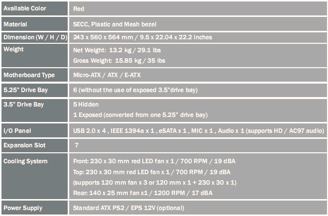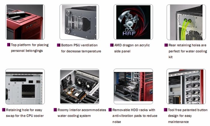 Entre suas distinções conta com o logo de AMD Fusion na janela de acrílico lateral e um logo dos processadores AMD Phenom em sua parte frontal, ainda que não é só isso já que conta com um grande espaço interior, montagem para refrigeração por água, bandejas removibles para discos duros, com pad antivibración para reduzir o ruído, painel incluso com 4 portos USB 2.0, 1 porto Firewire, 1 porto ESTA e conexão para microfone e aparelho auditivo, uma bandeja na parte superior para guardar acessórios, suporte para ventiladores (traseiro, frontal, superior), entre outras características que podem revisar a seguir: