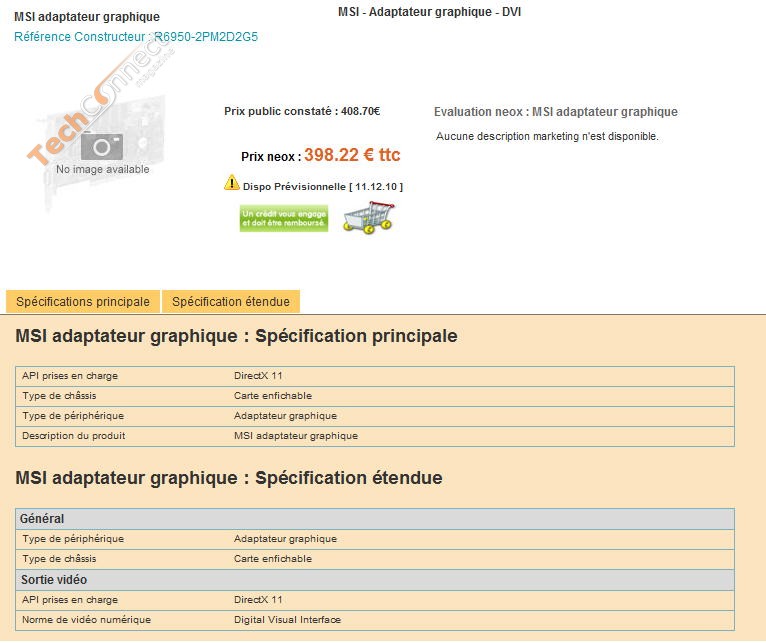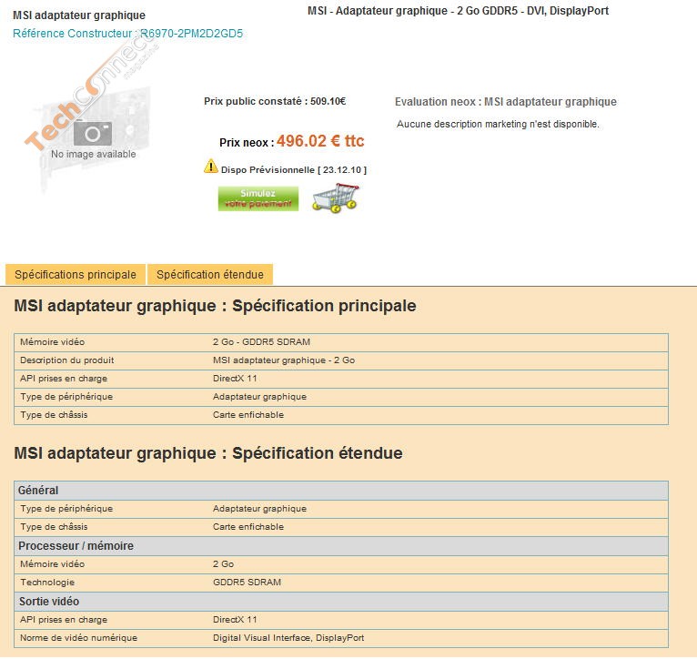 Já apareceram listadas a HD 6950 numa loja online francesa. A placa pertence ao fabricante MSI e concretamente é a placa de vídeo HD 6950 leva o número de modelo R6950-2PM2D2G5, oferecendo 1GB de GDDR5. Por sua vez a HD 6970 tem o número de modelo R6970-2PM2D2GD5 e vem com 2GB de GDDR5.