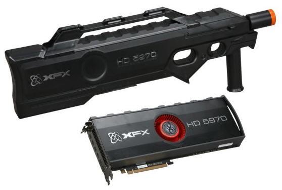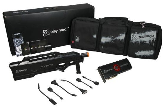 XFX não escatima em detalhes e inclusive a caixa tem um desenho relacionado com os jogos, já que a placa vem colocada dentro de uma arma automática de plástico.