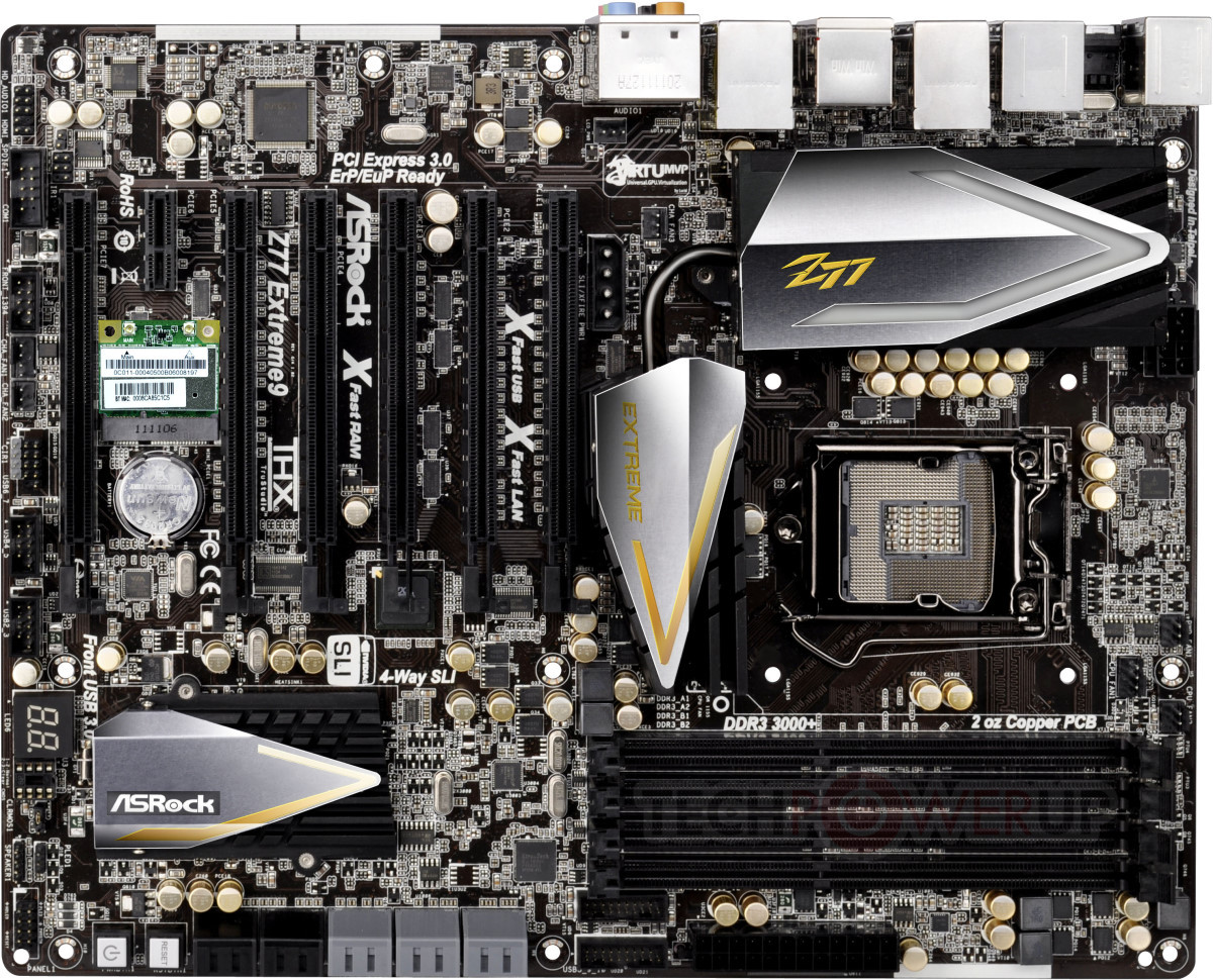 Vendo como alguns dos mais recentes processadores soquete LGA1155, tais como o Core i7-3770K, concorre com a plataforma Sandy Bridge-E HEDT, e como as GPUs de hoje estão começando a beneficiar da PCI-Express 3.0 em configurações 8 x e x 4, ASRock decidiu ir além com seu Z77 Fatal1ty Professional e lançou um novo modelo de série Extreme, com foco em recursos e conectividade. O Extreme9 Z77 da ASRock crams tem cada centímetro quadrado de seu PCB de tamanho ATX padrão com recursos.