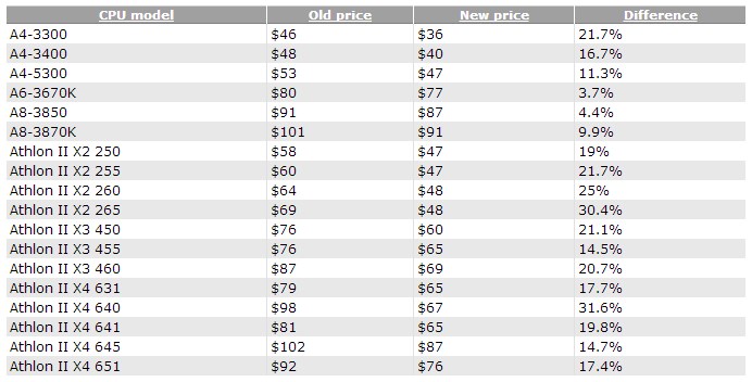Segundo lemos em techPoweUp! AMD teria realizado sérios recortes de preço em seus processadores AM3 tais como os Athlon II, e na maioria de suas APUs FM1. As cifras as podemos ver na seguinte imagem, mas vão desde um discreto 3,7% até um suculento 31,6%.
