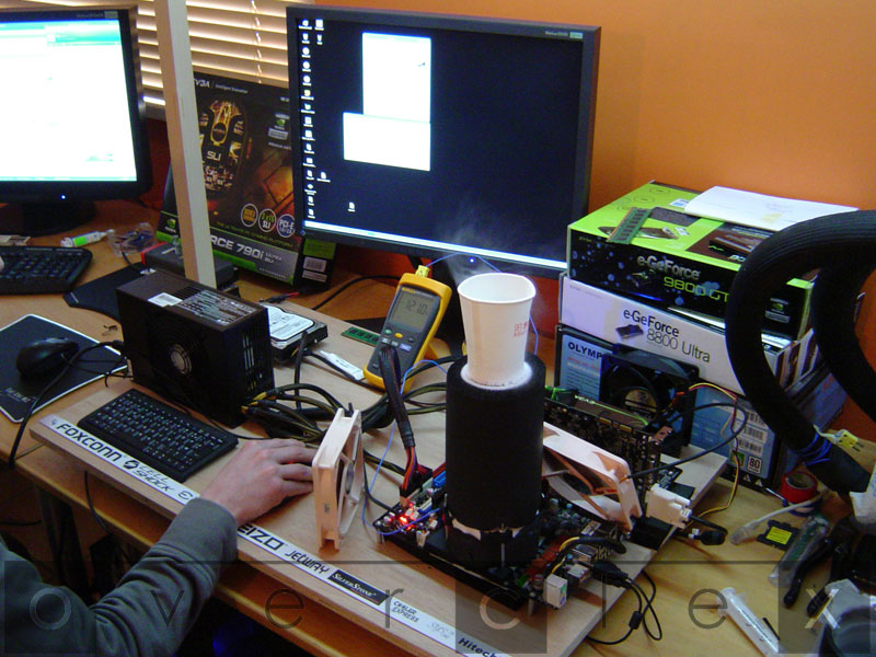 6.255 MHz. Esta foi a freqüência de operação atingida por um processador Core 2 Extreme QX9650 nas mãos dos correspondentes belgas do OvercleX. Para chegar a essa façanha, a tensão aplicada no processador foi aumentada para 1,88 V e o cooler “box” foi corajosamente substituído por um sistema de refrigeração extrema dotada de nitrogênio líquido ou LN2.