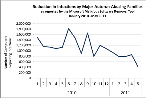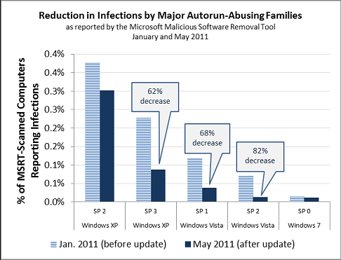 Mas os de Redmond decidiram eliminar dito autorun de seus sistemas e agora se orgulham em apresentar um relatório que reflete os benefícios obtidos de dita decisão em matéria de segurança informática. Veja os dois gráficos abaixo para fazer uma idéia da melhora.