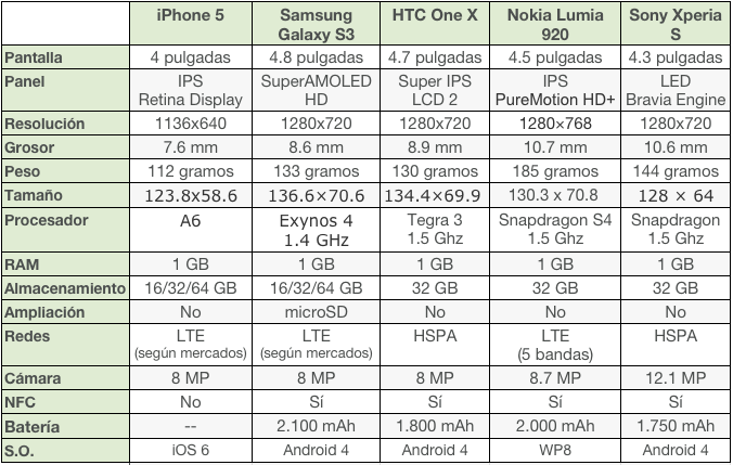 Comparativa (Foto: xataka.com)Muitas das características que um usuário deve olhar antes de decidir-se por um smartphone, é o sistema operativo onde podemos estar cômodo ou indentificado, o tamanho, resolução e tecnologia usada na tela, bem como a câmara de fotos, são as estrelas das comparativas.
