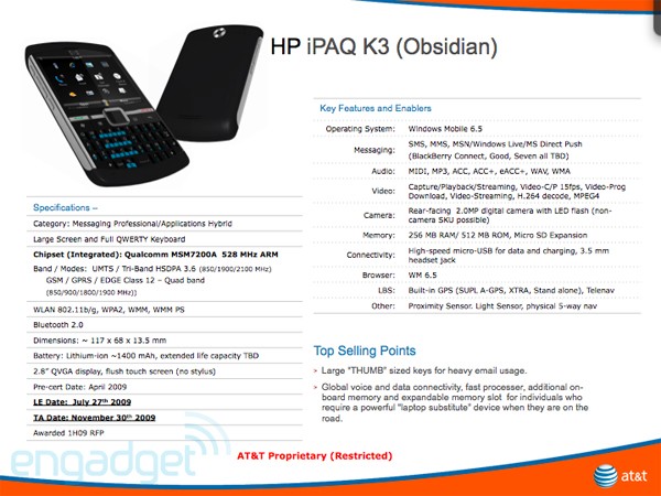 Se pode dizer oficialmente que a nova HP iPAQ K3 levará integrada uma tela AMOLED de 2,8 polegadas, câmara de 3 megapíxeles, processador de 528 MHz, conectividade HSDPA 850/1900/2100 MHz, WiFi b/g e Bluetooth, teclado QWERTY completo, GSM cuatribanda e A-GPS, além de jack de 3,5 mm, ranhura para cartões MicroSD, 256 megabytes de cor RAM, 512 de cor ROM e sistema operativo Windows Mobile 6.5.